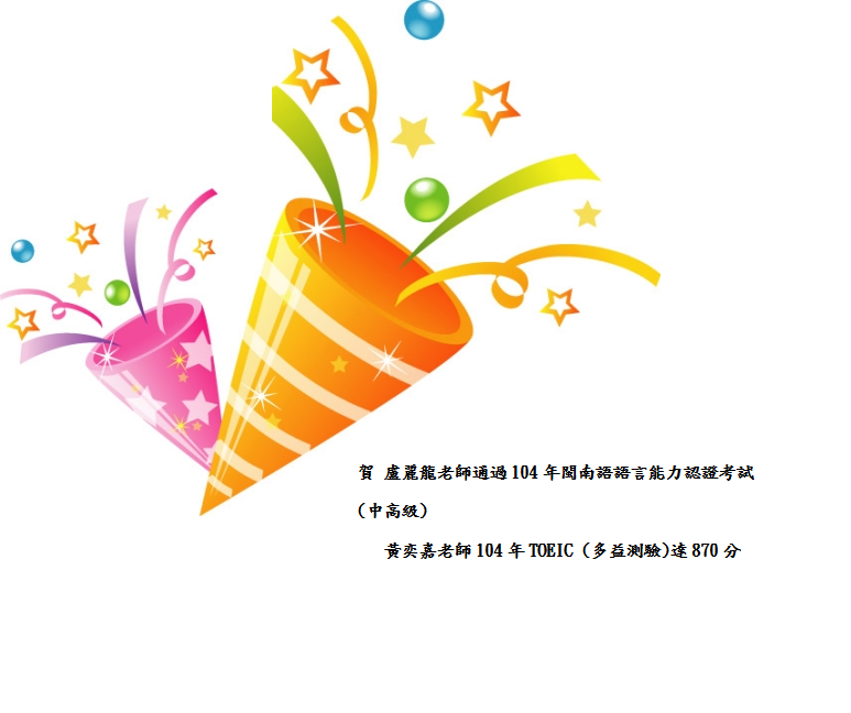 賀 盧麗龍老師通過104年閩南語語言能力認證考試 (中高級) 黃奕嘉老師104年TOEIC (多益測驗)達870分