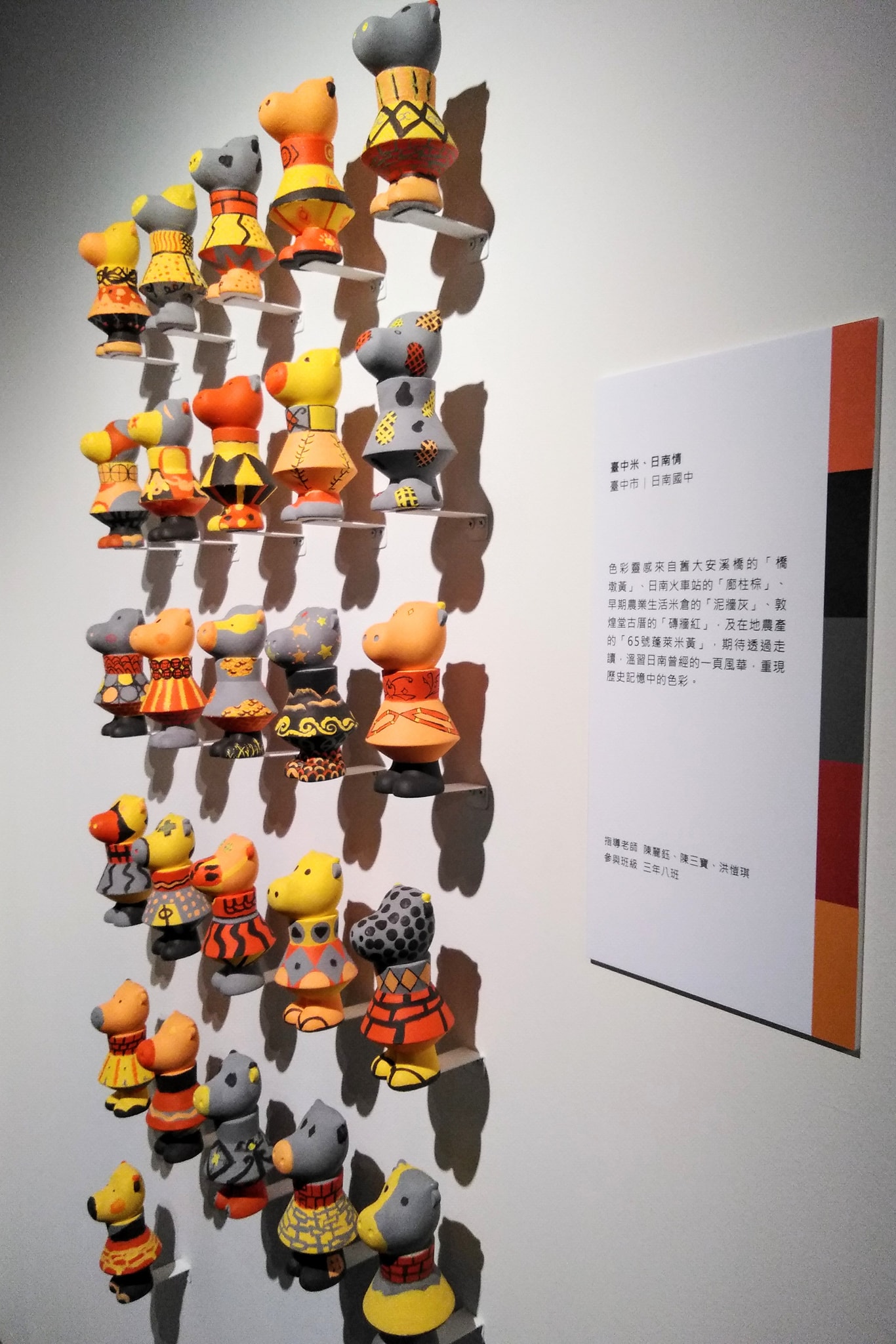 第二年帶領學生參與學學文教基金會承辦的感動生肖彩繪展覽,學生完成的彩繪小牛比去年又更上一層樓了,更有內涵也更細緻。我們不但找出日南和台灣蓬萊米「台中65號米」歷史發展的連結,也把日南市街的窗花圖案、木造車站、全國唯一鐵公路共構的舊大安溪橋等史蹟結合小牛,重現百年前日南地區的曾經風華。校外參觀當學生們看到自己的作品在展覽館鎂光燈下閃耀時,興奮與榮耀溢於言表,身為指導老師的我與有榮焉。所有的辛勞都值得了!